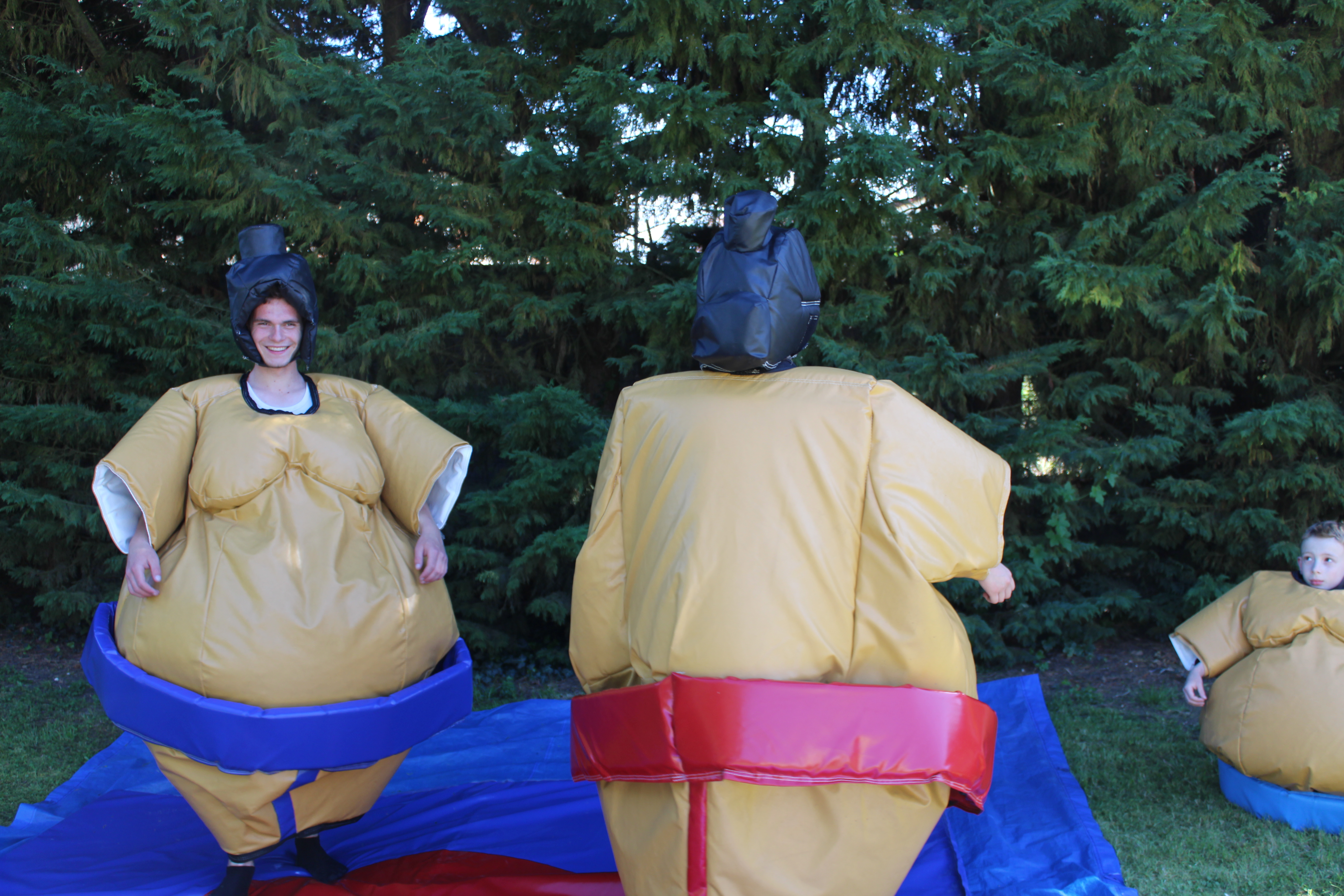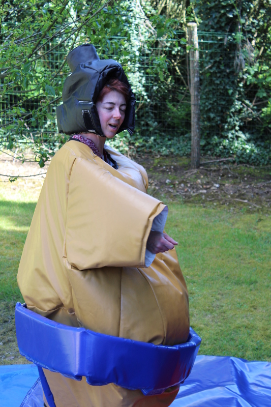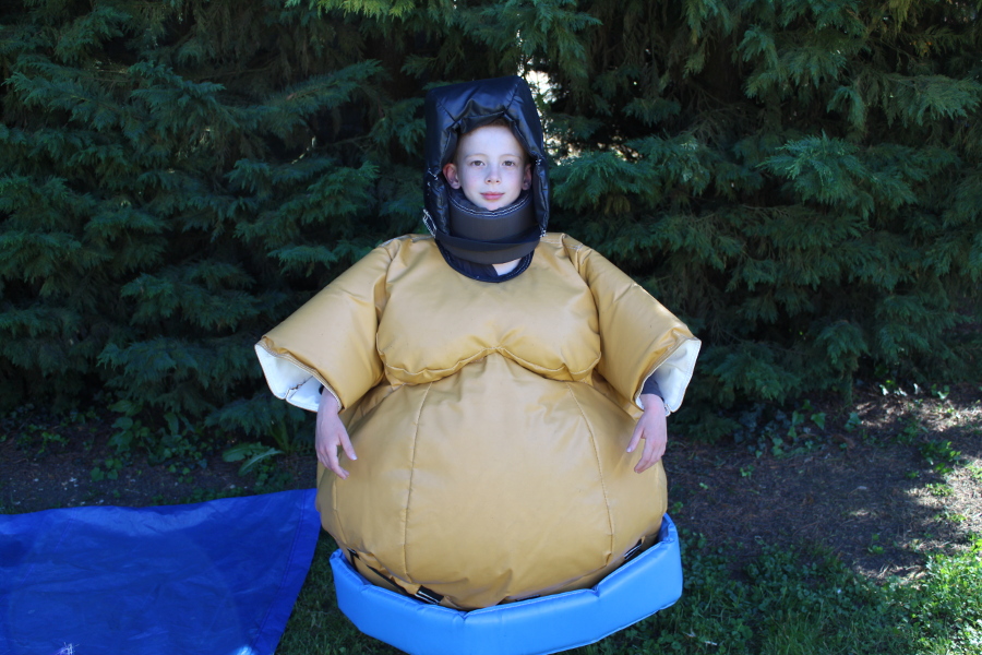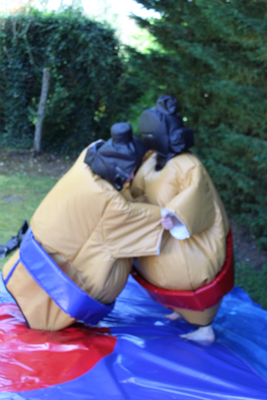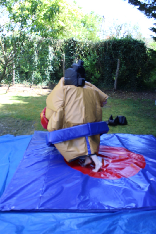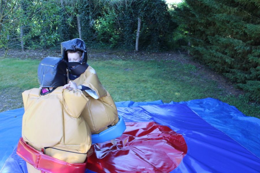 Le prix indiqué comprend deux costumes de sumo protections incluses ainsi que le tapis de sol. Réussirez-vous à ne pas vous faire éjecter hors de celui-ci ?
